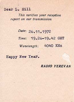 Empfangsbestätigung von Radio Yerevan, vom 26. November 1972, 4040 kHz, aus der Sammlung von Lothar Sill Kurzwelle historisch